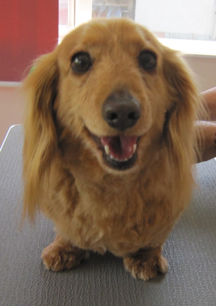 本日のお客さま紹介は、M.ダックスのパールちゃん。 足先やお尻の毛がフッサフサ。 お散歩に行くとゴミがいっぱい付いちゃうね(笑) トリミングでスッキリ短くカットしました。